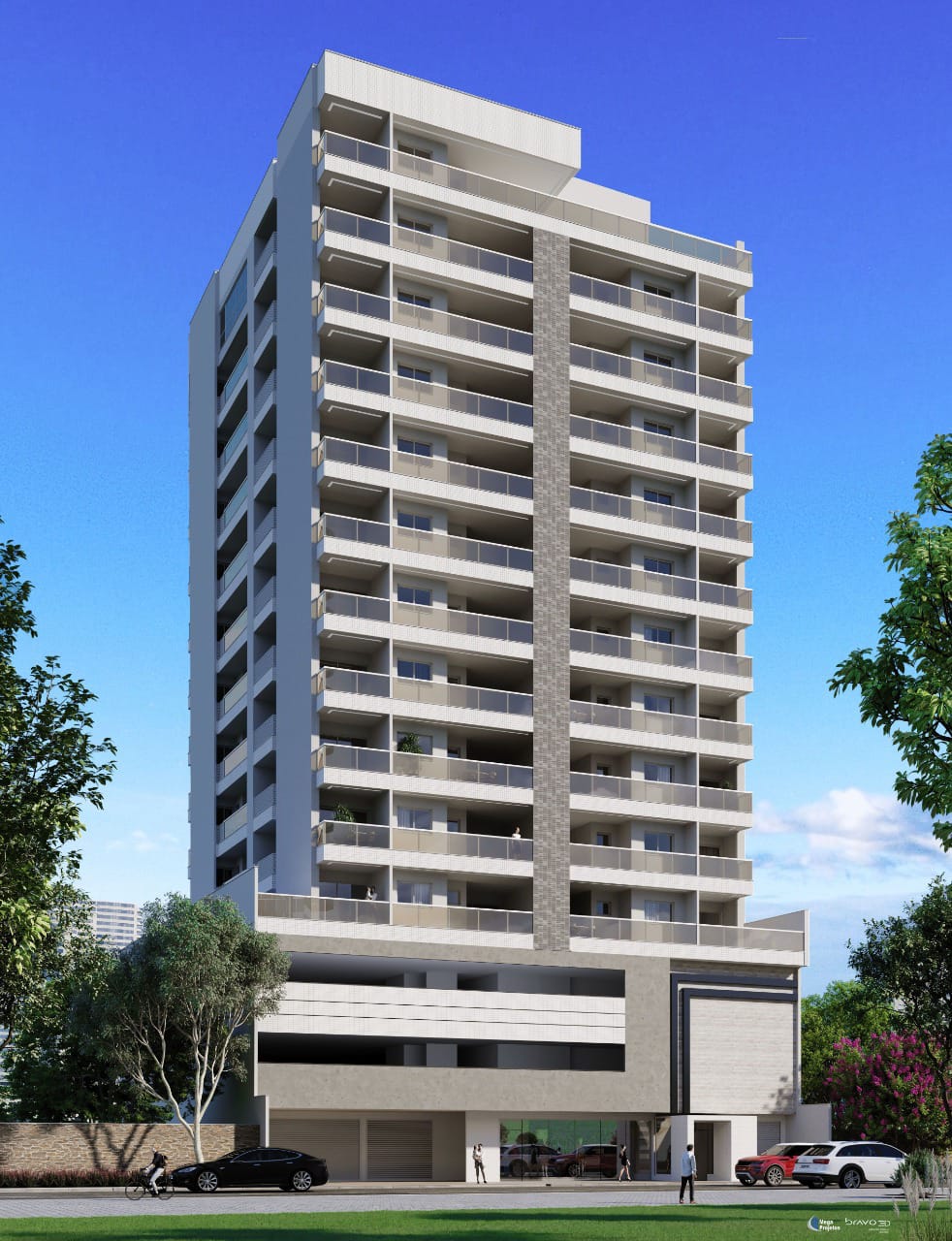 • Aptos com dois quartos, sendo um suíte, sala de estar conjugada com sala de jantar, cozinha, área de serviço, varanda, uma vaga de garagem.